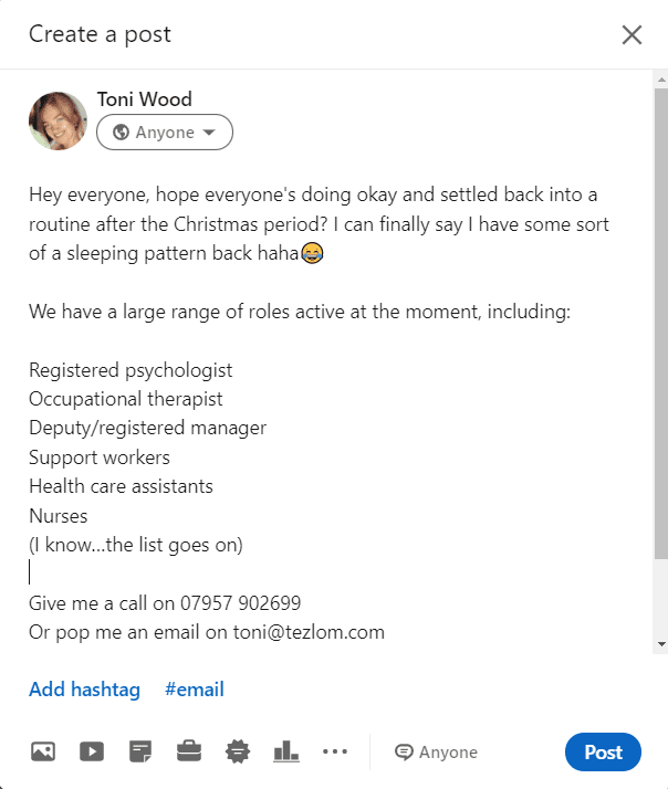 This is where you will write a post advertising the job roles you currently have active. This can be done in list format or specific to a particular job. In all honesty, there’s no right or wrong way of posting on Linked in, you can make it as personal as you like. I have given you an example below.