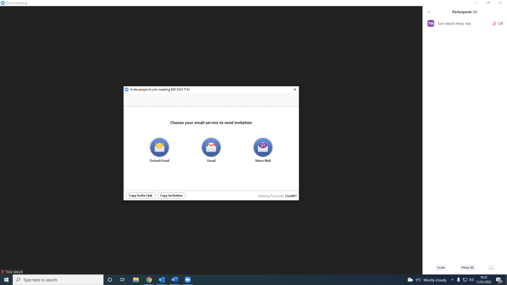 A pop up will appear as shown below. It is at this point where you can invite an attendee directly via email. It gives you a choice of inviting via a default email address, Gmail or Yahoo. You can also copy the link to the zoom as below and invite attendees in any way you please (e.g. via outlook emails). For this example, we will click on ‘Default Email’.