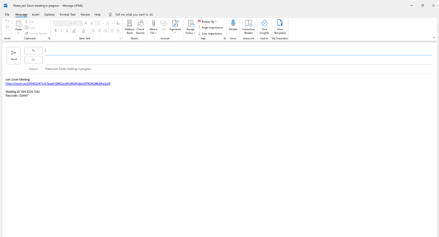 Once you have clicked on ‘Default Email’, it will display an empty email template with the Zoom meeting link, meeting ID and passcode already written. You will need to type the attendees email address in the ‘To’ section. Once you have done this, click ‘Send’.