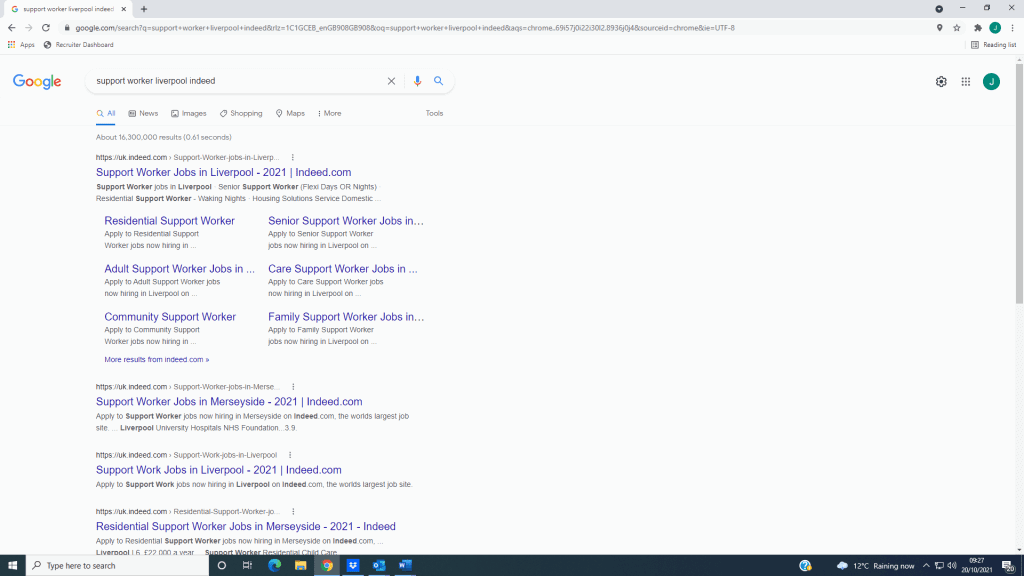 - Open a Google Tab, and search ‘Support Worker (your area) Indeed’. This will bring up a list of results, with the top result being a tab where there is a list of jobs as a jobseeker. Click on this.